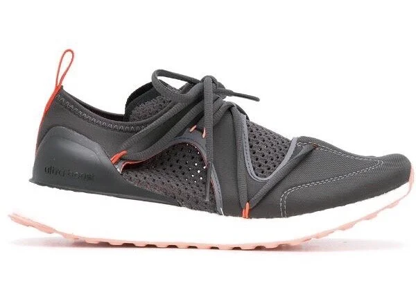 Granite grey Ultra Boost sneakers from adidas by Stella McCartney featuring a signature Primeknit upper, round toe, lace-up front fastening, pull tab at the rear, a branded insole and a white rubber sole.