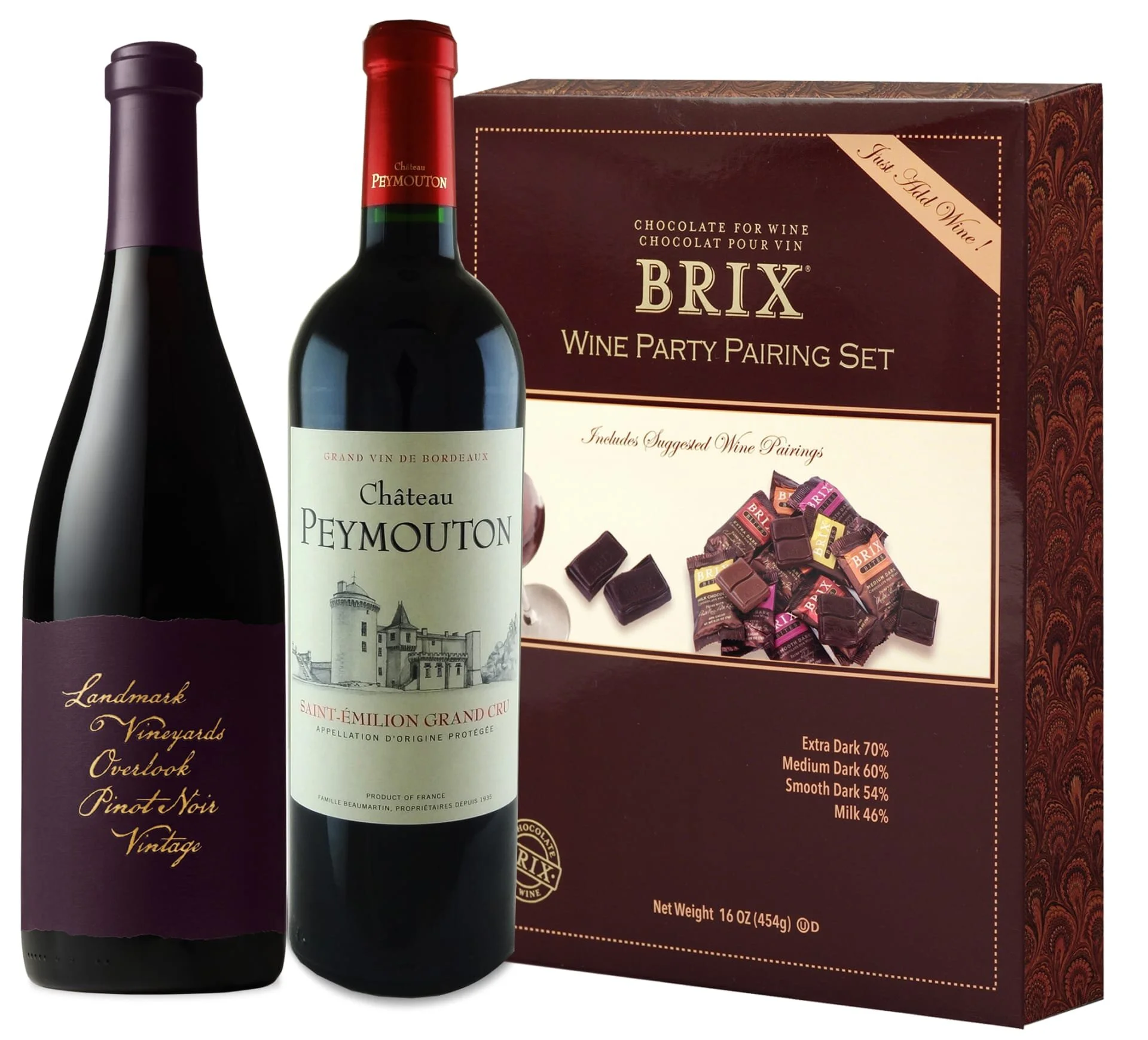 Indulge in the delicious tastes of red wine and chocolate. The gift set contains two bottles rated 91 by Wine Enthusiast - 2016 Landmark Overlook Pinot Noir from California and 2016 Chateau Peymouton from Saint Emilion, France - and 65 individually wrapped chocolate bites in extra dark 70%, medium dark 60%, smooth dark 54%, and milk 46%.